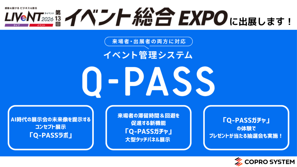 2026.01.14 | プレスリリース 【コプロシステム】プレスリリース/【展示会出展のお知らせ】イベントDXを加速させる「Q-PASS」、イベント総合EXPO 2026に出展〜次世代展示会を示す「Q-PASSラボ」と来場者参加型「Q-PASSガチャ」を公開、体験プレゼントも実施〜